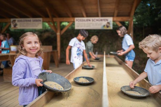 Abenteurer aufgepasst! Im Schatzgräberfeld wartet die aufregende Suche nach eurem persönlichen Amethyst zum Mitnehmen. Wer lieber echte Goldgräberstimmung erleben möchte, für den gilt es in der überdachten Goldwaschanlage wahlweise funkelndes Katzengold, bunte Edelsteine oder 30 Millionen Jahre alte Fossilien zu entdecken. Der Fund gehört natürlich euch! Für jede Menge Spaß sorgen außerdem der ausgiebige Abenteuerspielplatz und der Tiererlebniswald mit Kaninchen, Hühnern und Ziegen. Sowohl in- als auch outdoor gibt es jede Menge lauschige Plätze für eine stärkende Schatzgräberjause zwischendurch.